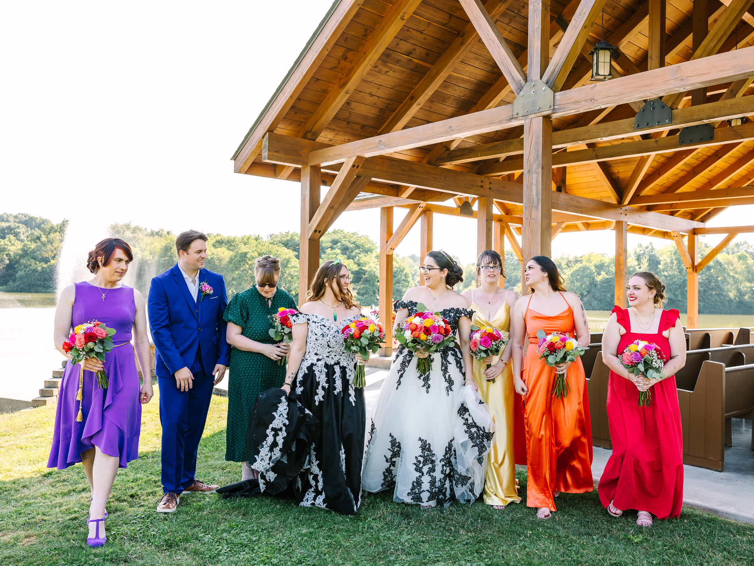 K + J’s summer celebration at the SNPJ Recreation Center in Western PA was big, bold, and beautiful. Their vibrant, peacock-inspired decor really captured their personality as a couple, and every detail was carefully considered (their dresses were inverse colors of each other!) Their ceremony took place at the gorgeous outdoor Heritage Pavilion, which was actually constructed by one of their grandpas! The couple then invited guests the Alpine Room for a lively reception, complete with dancing, pizza, and a peacock-feathered cake. (Fun fact – K + J are furries! They had their fursuits on site, but unfortunately didn’t have enough time to wear them.)