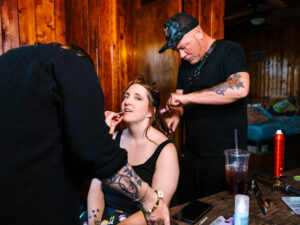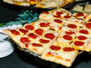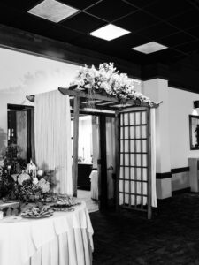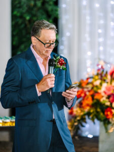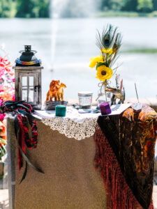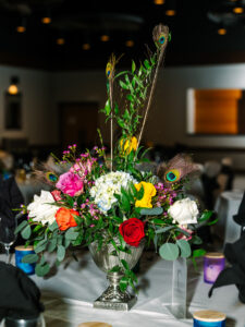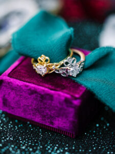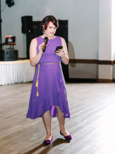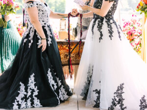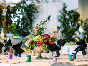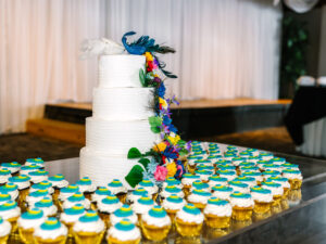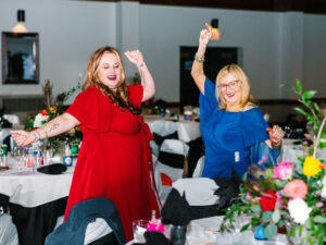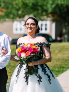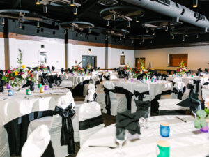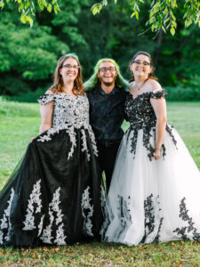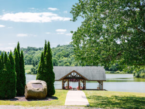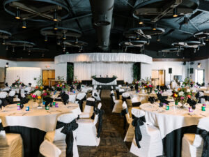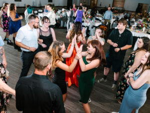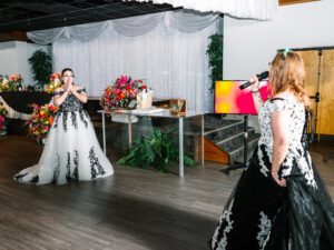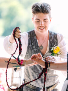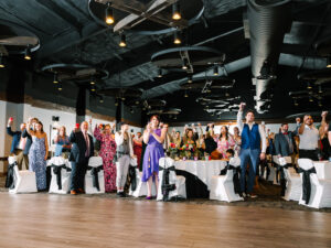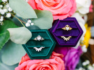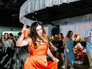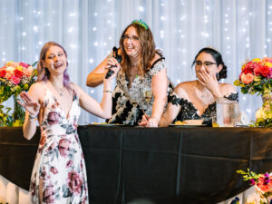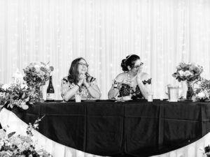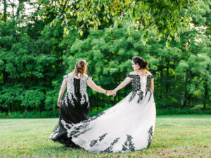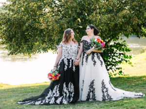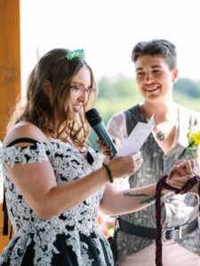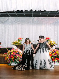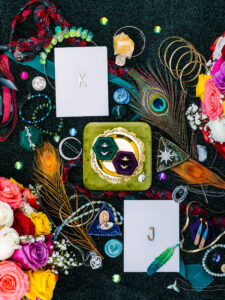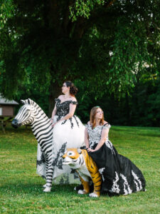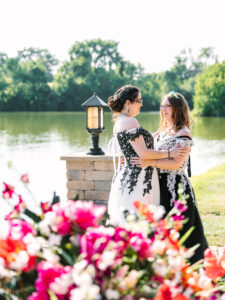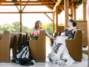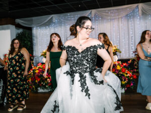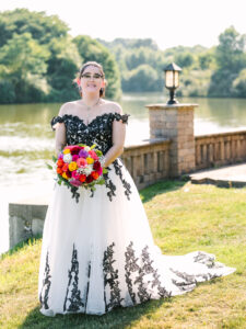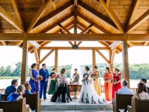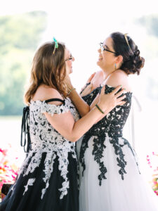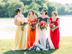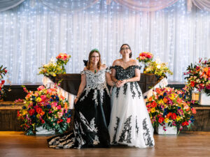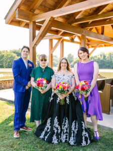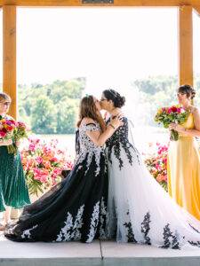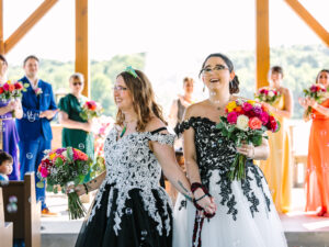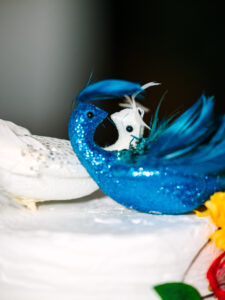 K + J’s summer celebration at the SNPJ Recreation Center in Western PA was big, bold, and beautiful. Their vibrant, peacock-inspired decor really captured their personality as a couple, and every detail was carefully considered (their dresses were inverse colors of each other!) Their ceremony took place at the gorgeous outdoor Heritage Pavilion, which was actually constructed by one of their grandpas! The couple then invited guests the Alpine Room for a lively reception, complete with dancing, pizza, and a peacock-feathered cake. (Fun fact – K + J are furries! They had their fursuits on site, but unfortunately didn’t have enough time to wear them.)